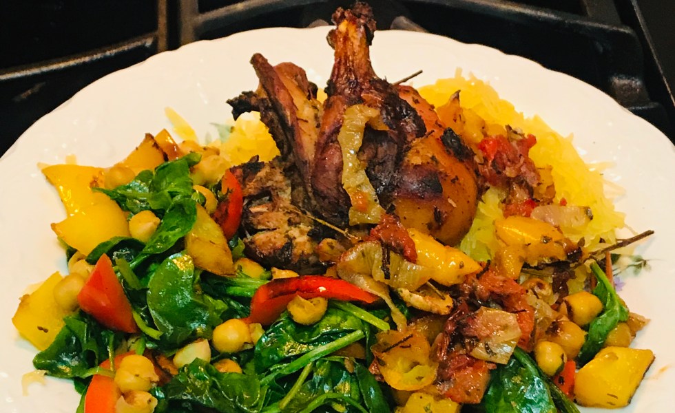 - First drizzle some olive oil in a frying pan, saute mixed red, yellow bell pepper, onion, garlic , chickpea and sprinkle dash seasoning. Cook this until it is brown or chickpea is brown. After that add the spinach and squash . Sprinkle more dash seasoning, mix it up and cook for 1 minute.